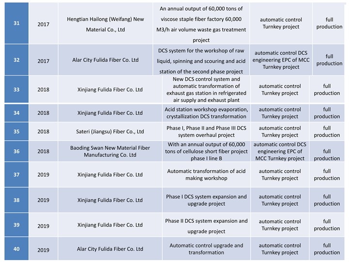 At the construction of domestic new viscose factory in nearly five years, Process control system for viscose staple fiber production of JTDC, main contractor of automatic control instrument, main contractor of MCC, installation, debugging and operation that are all got success one-time.so that the company has obtained the good market reputation, exceeded 50% market share in the domestic market that based on service for customer wholeheartedly, ensure the project stabl